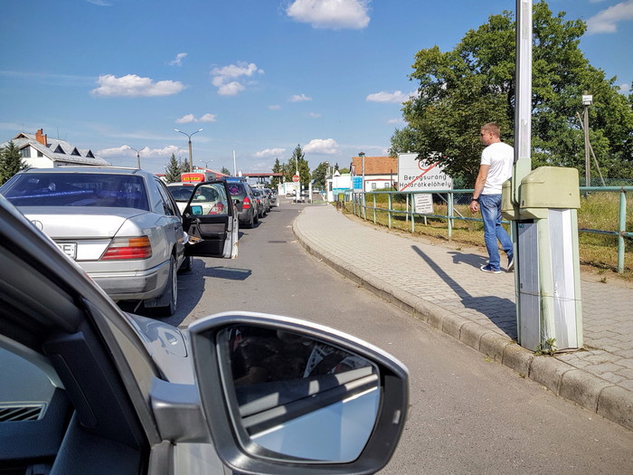 Po avtocesti premiki potekajo hitro. Kratek postanek na črpalki in že sva mimo Blatnega jezera. Madžarske avtoceste so dobro urejene, treba pa je biti zelo pozoren na hitrost. Radarske kontrole se vrstijo ena za drugo. Malo pred madžarsko ukrajinsko mejo ustaviva ob cesti, da malo prepakirava prtljago v prtljažniku. S seboj imava prenosnike in fotoaparate, ne pričakujeva pa kakšnih večjih sitnosti zaradi tega. Pa vendarle. Na madžarski strani morava odpreti prtljažnik, carinik naju hitro izpusti naprej. Pogled na stoječo kolono pred ukrajinskim prehodom nama da vedeti, da tu ne bo šlo tako hitro. Tudi postopek je drugačen. Pri prvi zapornici dobiva kontrolni listek z izpisano registrsko številko najinega avta. V naslednji uri se pomakneva za sto metrov do carinske kontrole. Tam izstopiva iz avtomobila in neseva potrdit potne liste s kontrolnim kuponom do okenca. Zapeljeva mimo, nakar si najino vozilo ogledajo še policisti. Predvsem jih zanima številka šasije pod pokrovom motorja, zadaj sploh ne gledajo. Nadaljujeva do zadnje zapornice. Tam naju ustavi oborožen vojak. Tomaž mu pomoli potne liste in prometno dovoljenje, on pa se z glavo skloni v kabino: Kavi, kavi, money, money! Tomaž zmedeno zmajuje z glavo, čeprav nama je obema jasno, kaj želi od naju. V izogib zapletu mu dava pet evrov in končno sva na drugi strani meje.