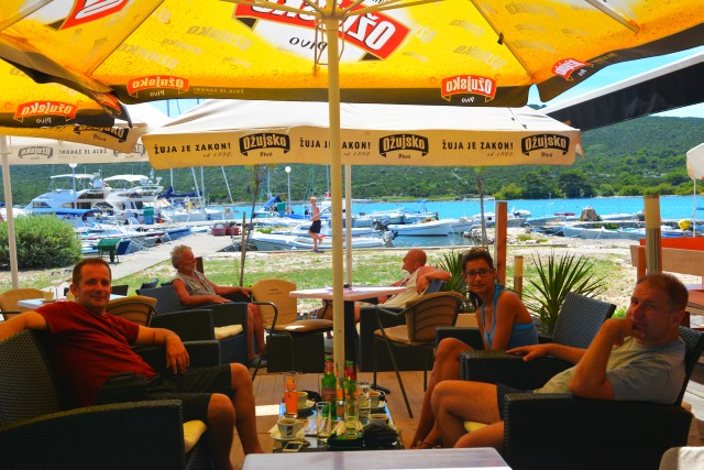 Iz hriba Straža smo prišli prepoteni in se je bilo potrebno stuširati. Žal v pristanišču nimajo tušev. Če si z jadrnico, je edino možno tuširanje skok v vodo. Vsi so skok v vodo opravili kar z jadrnice. Jaz pa ne, ker sem imel malo slab občutek, da je voda v pristanišču lahko malo umazana. Zato sem se odločil, da se grem okopati na 100 metrov oddaljeno plažo.